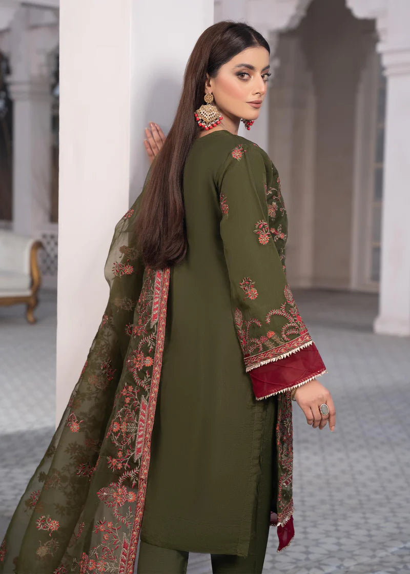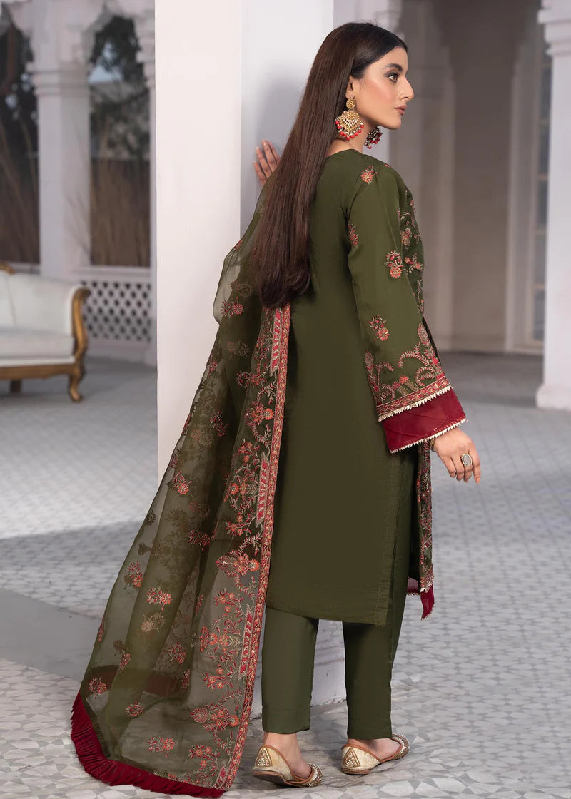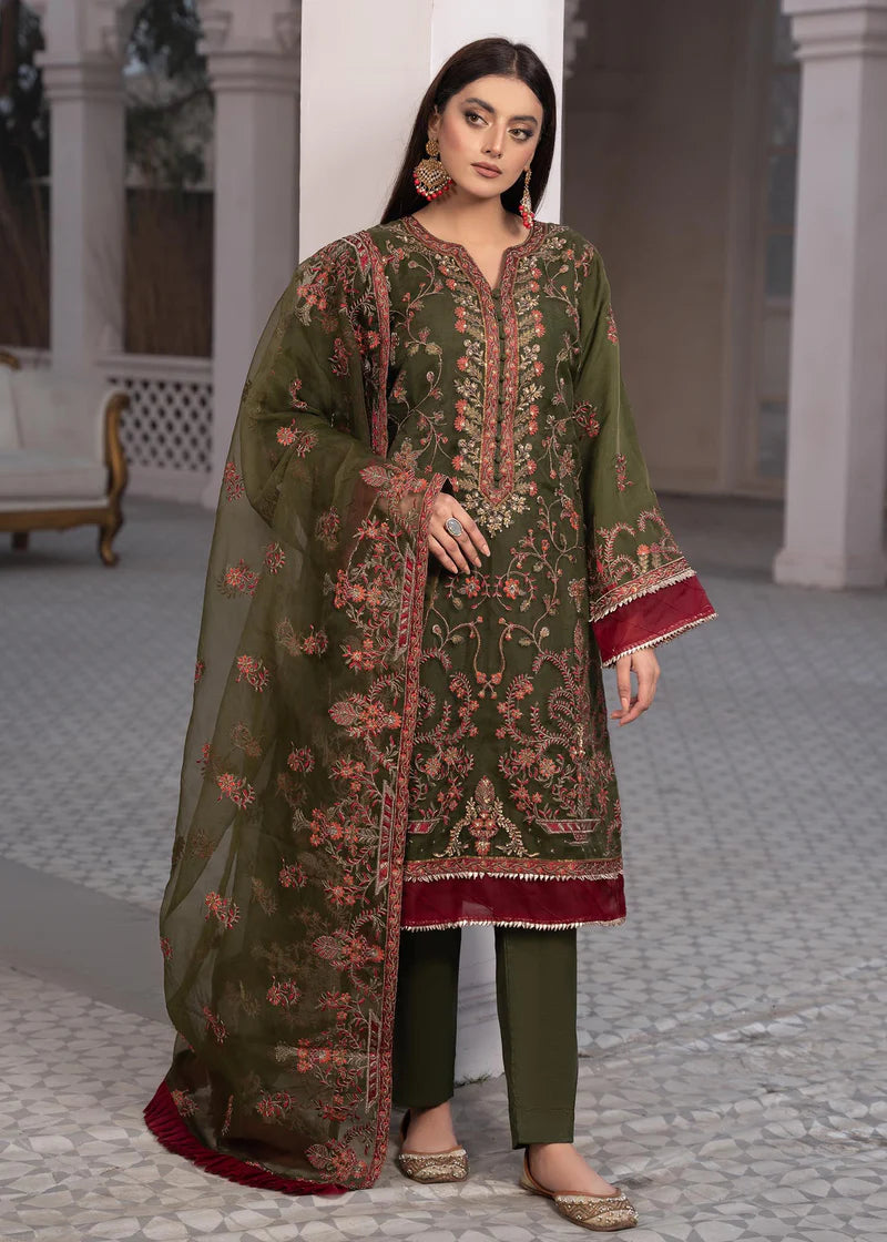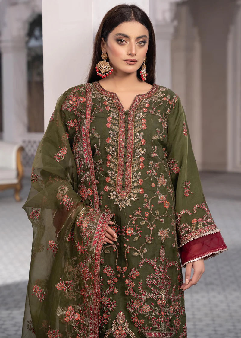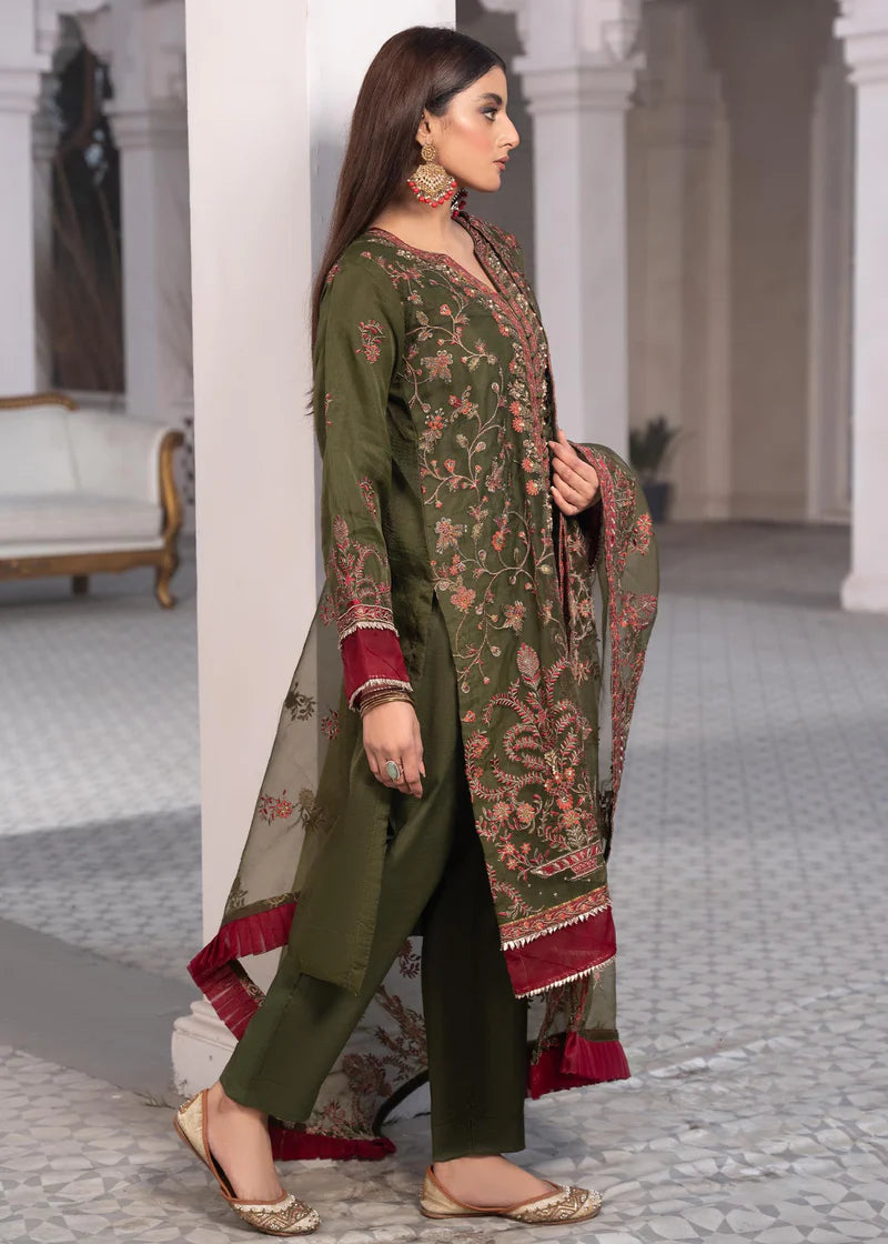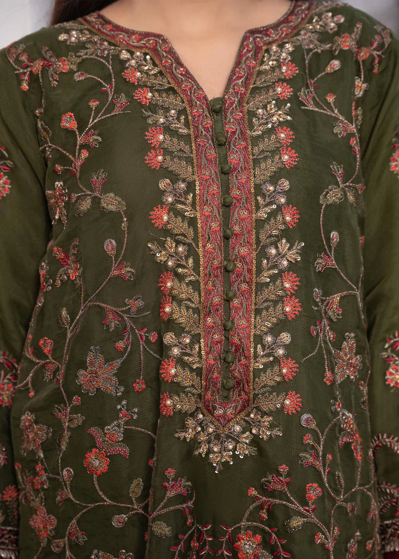 Description: Dark Mehndi Green colored organza shirt with viscose trouser and organza dupatta in mehndi green color.