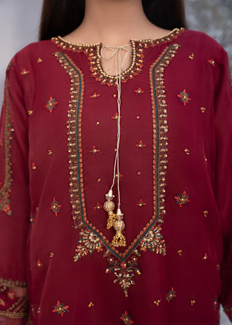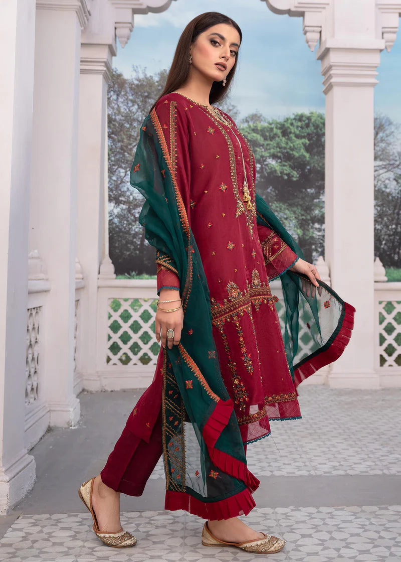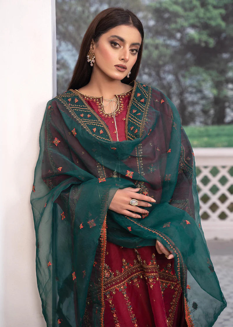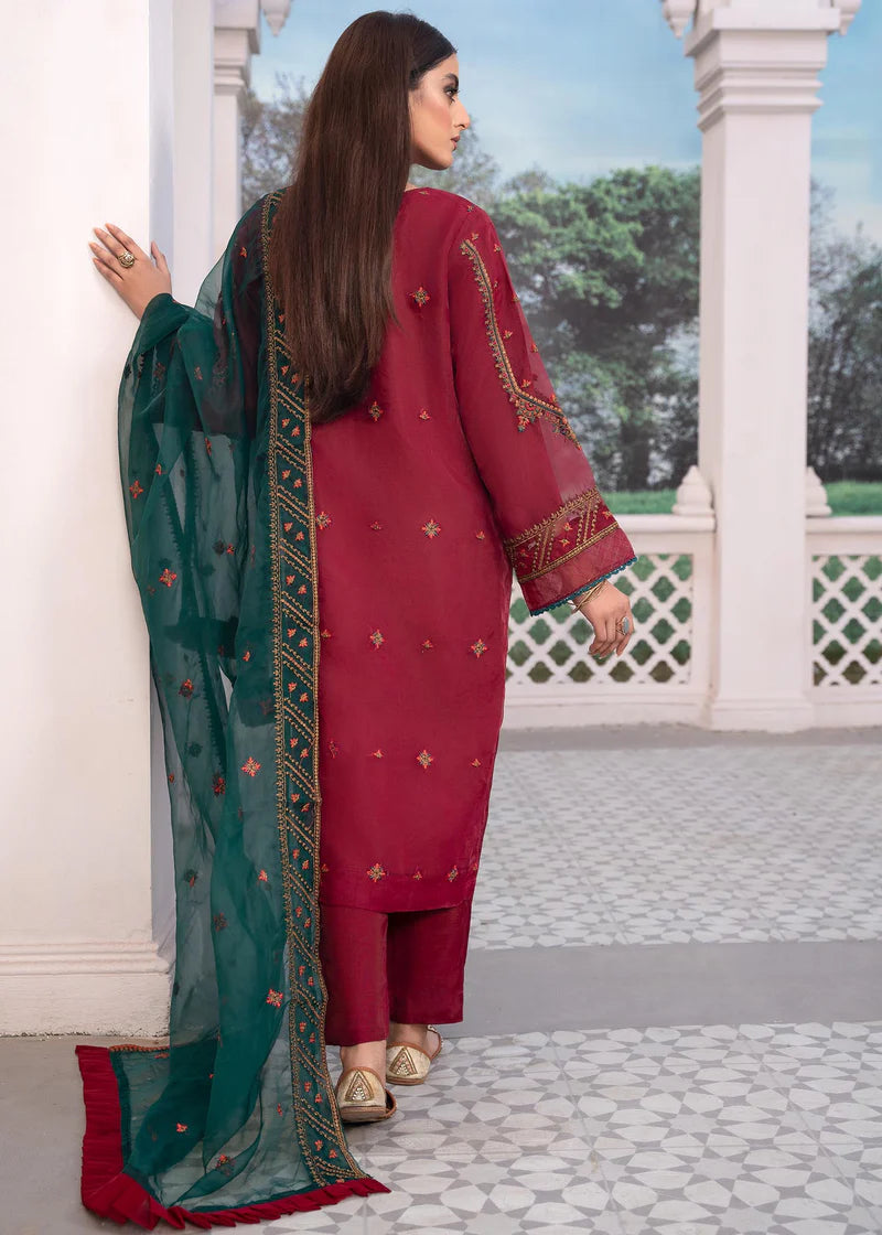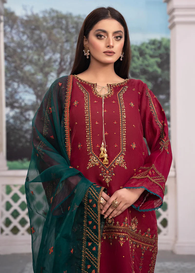 Description: Shirt organza in maroon color with bottle green dupatta. Trouser is maroon in Viscose material