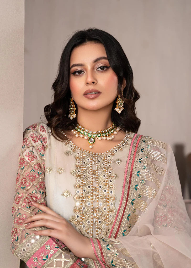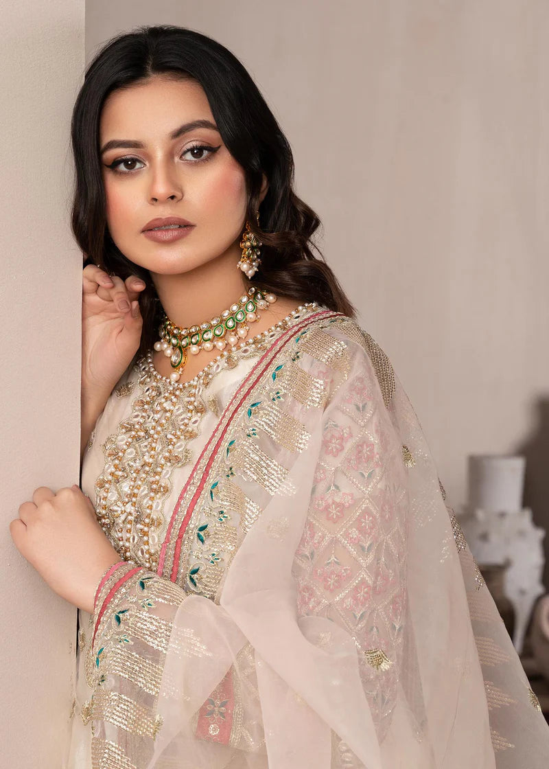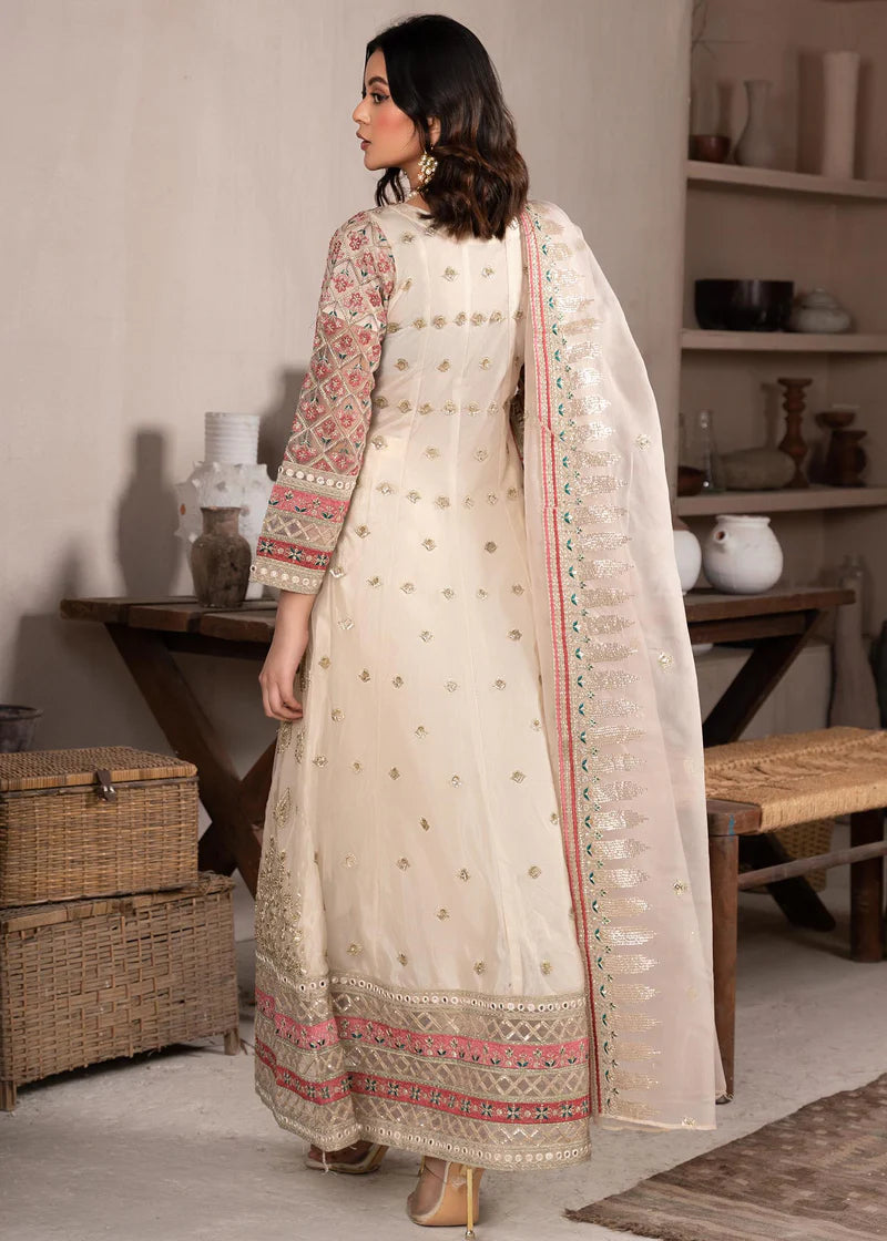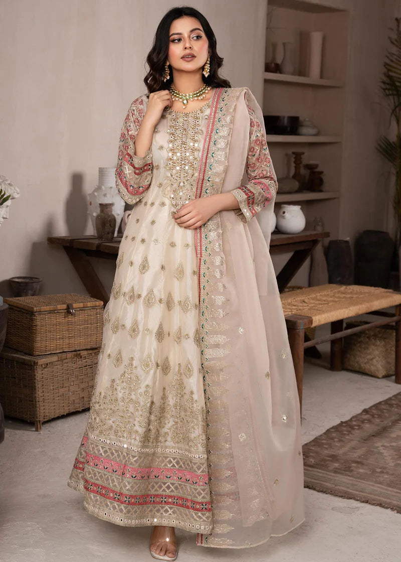 Description: Net embroidered maxi enhanced with adda work. Same base color organza embroidered dupatta. Viscose trouser.