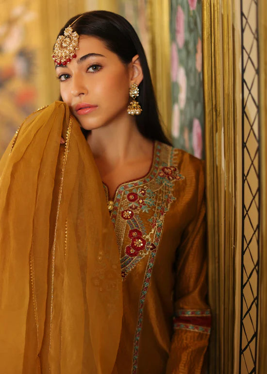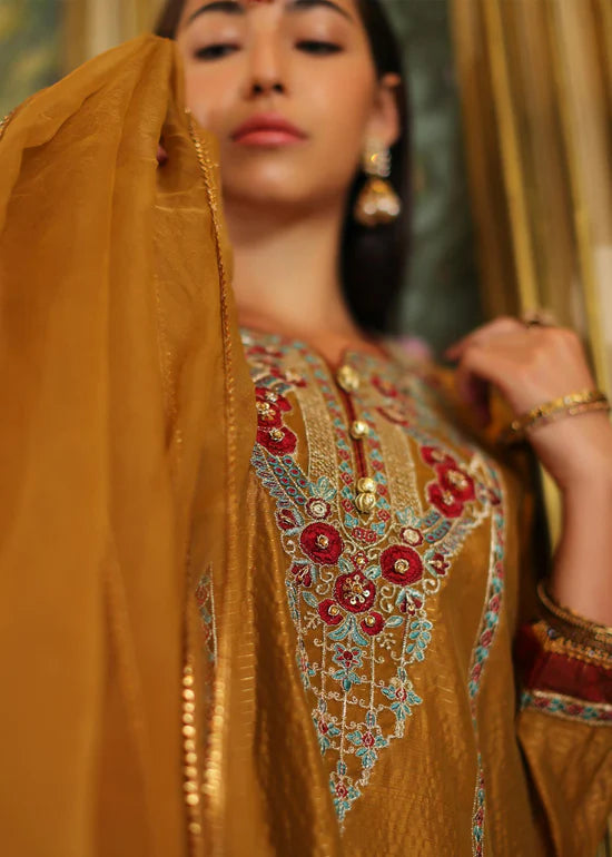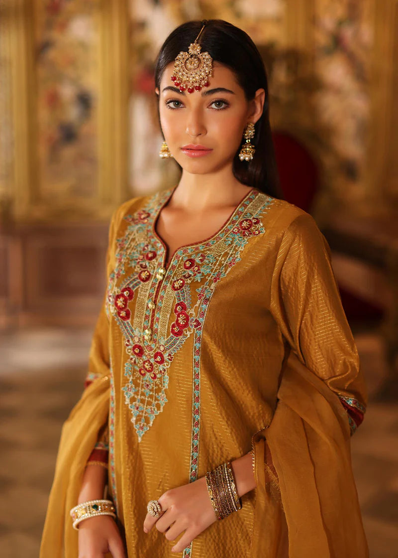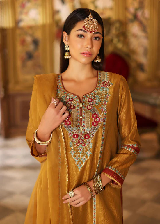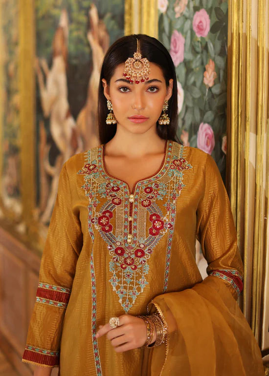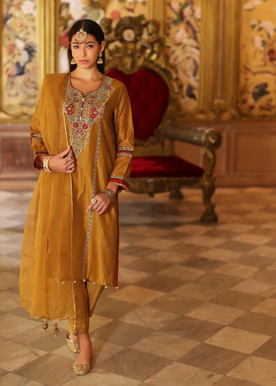 Description: Mustard Straight shirt with machine embroidery on the panels and the neckline. The embroidery is further outlined with tilla. Paired with Raw silk straight trousers and organza dupatta.