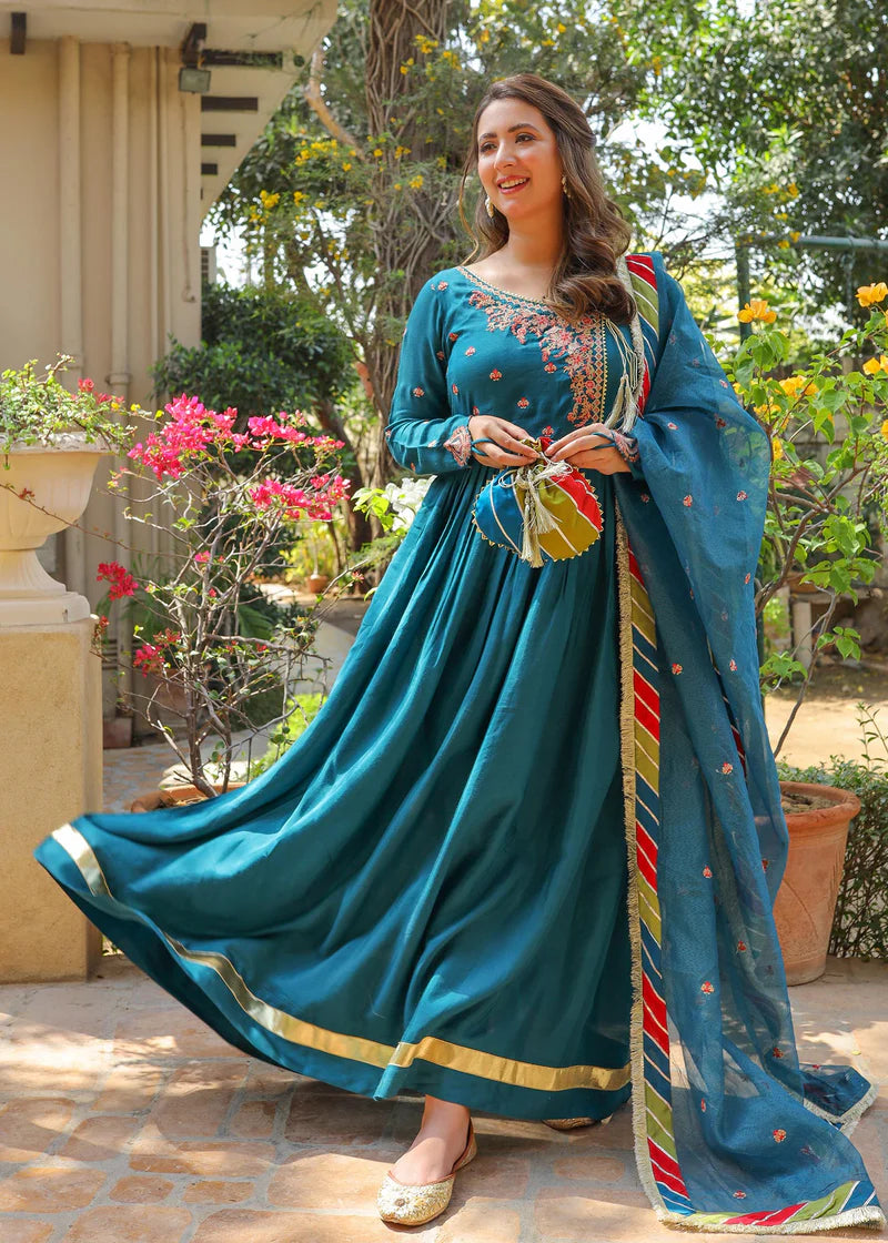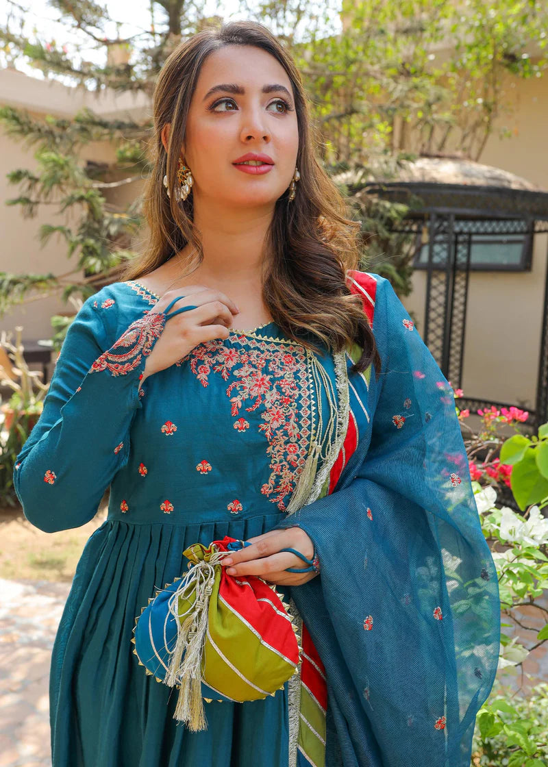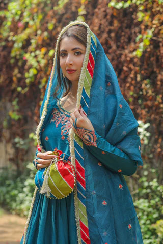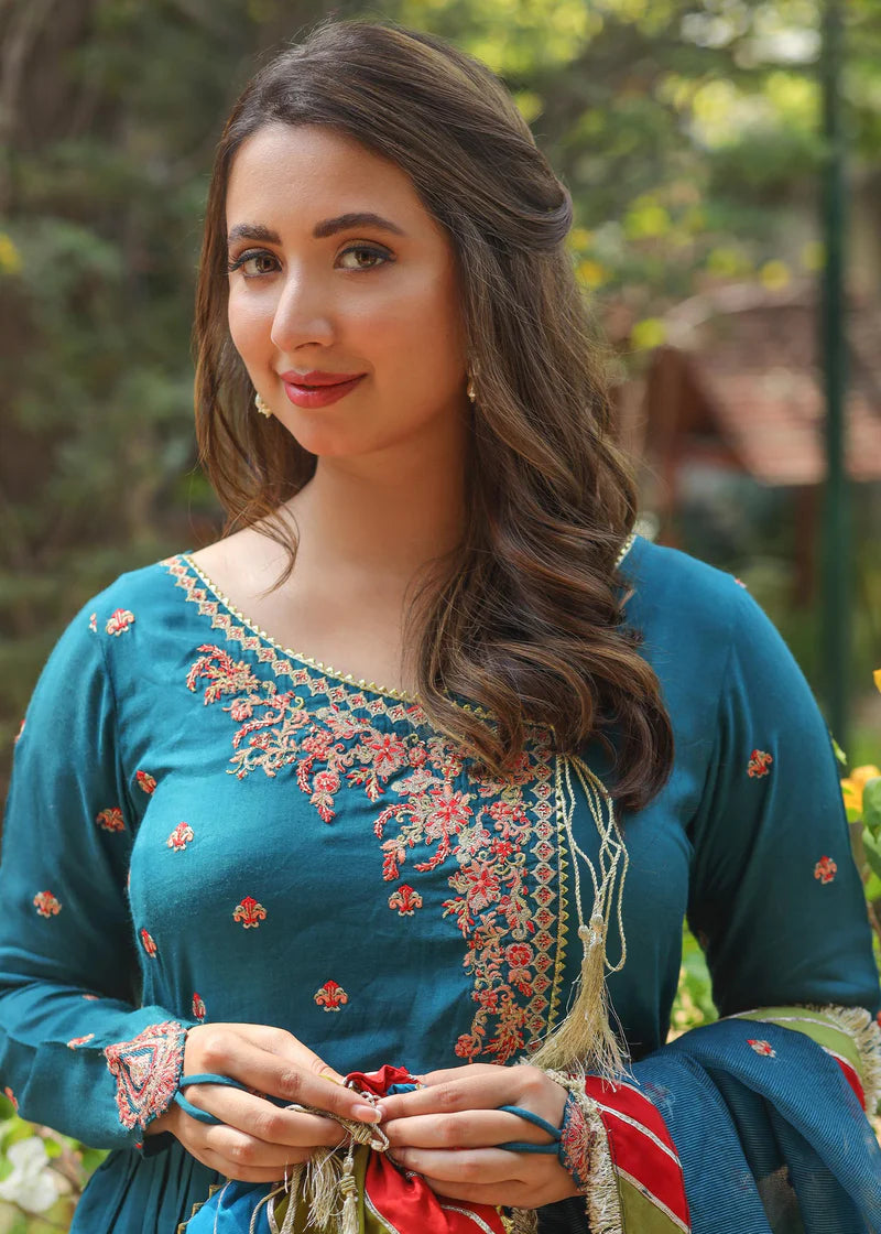 Description: Dhanak is a teal angharkha frock, with red and peach resham and golden sequins and zari embroidery on neckline, finished with samosa lace and a golden dori tassel. Princess cut embroidered sleeves with finger loops attached. Chatapatti embellished dupatta to compliment the outfit with kiran lace edges and chan embroidery.