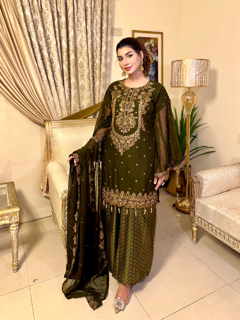 Description: Atimeless ensemble that captivates with its exquisite hand embroidery adorning the neckline and the bottom of the shirt. The billowy sleeves add an enchanting allure to this ensemble, elegantly complemented by the Banarsi Palazzo and delicate chiffon embroidered dupatta
