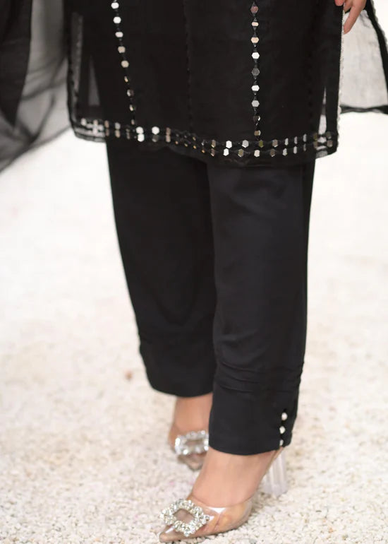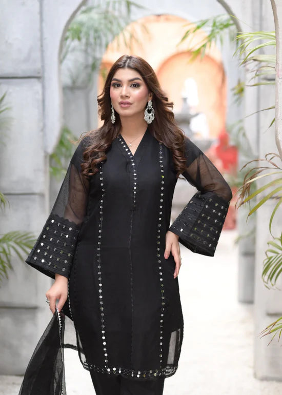 Description: Intricate mirror work on the shirt, a luxurious Khaddi Net Dupatta, and a soft fabric trouser
