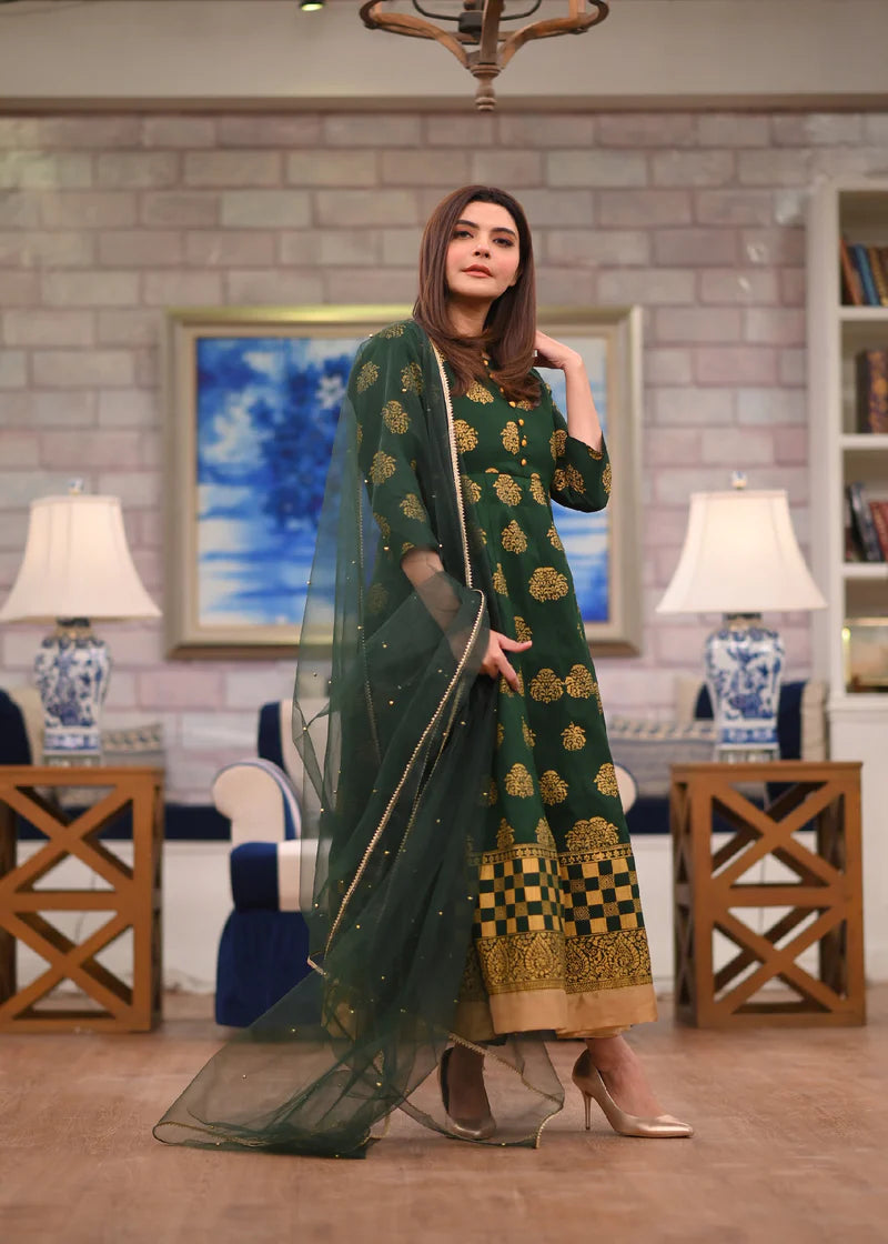 Description: Fully Block Print With Various Patterns On Neck Panel, Specially Flare Patches & Including Embellished Palla On Border. Frock Length Is 55 Inches. Trouser: Complimented In Same Stuff. Dupatta: Presenting In Net Covered With Goti Lace (no Beads).
