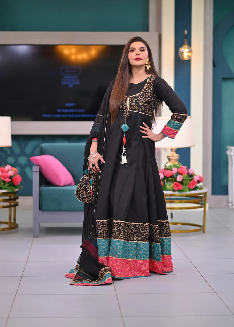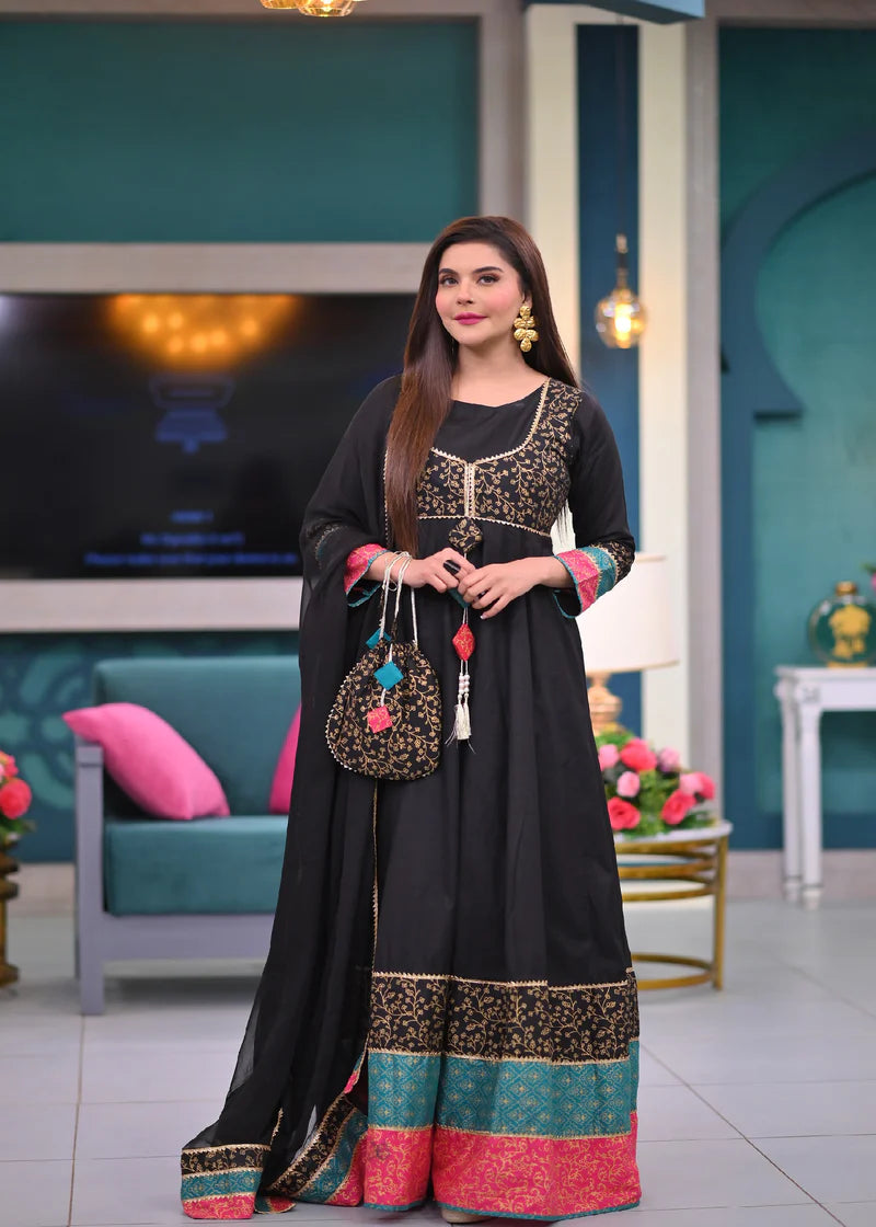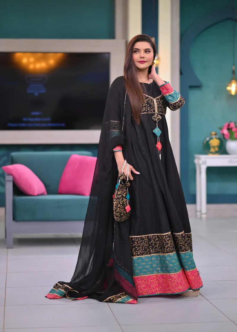 Description: This stunning outfit is perfect for any occasion, whether it's a formal event or a casual day out. The printed jacket features a unique neck panel and is made from high-quality fabric, ensuring both style and comfort. The three layers of multi-shaded border add a touch of elegance to the overall look. The dupatta is presented in chiffon and also features layers of border, adding a flowy and feminine touch. The trouser is made from Same fabric, completing the outfit with its perfect fit and complementary design.