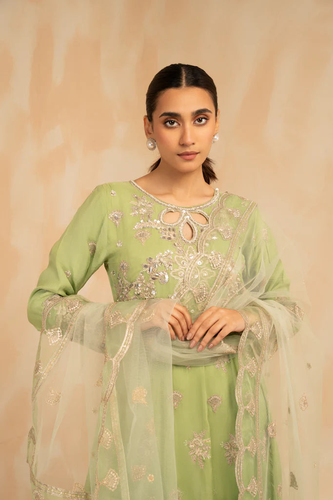 Description: The Slim fit dress is Bemberg Georgette Chiffon fabric, with Kattan Silk Trouser and Organza Dupatta.